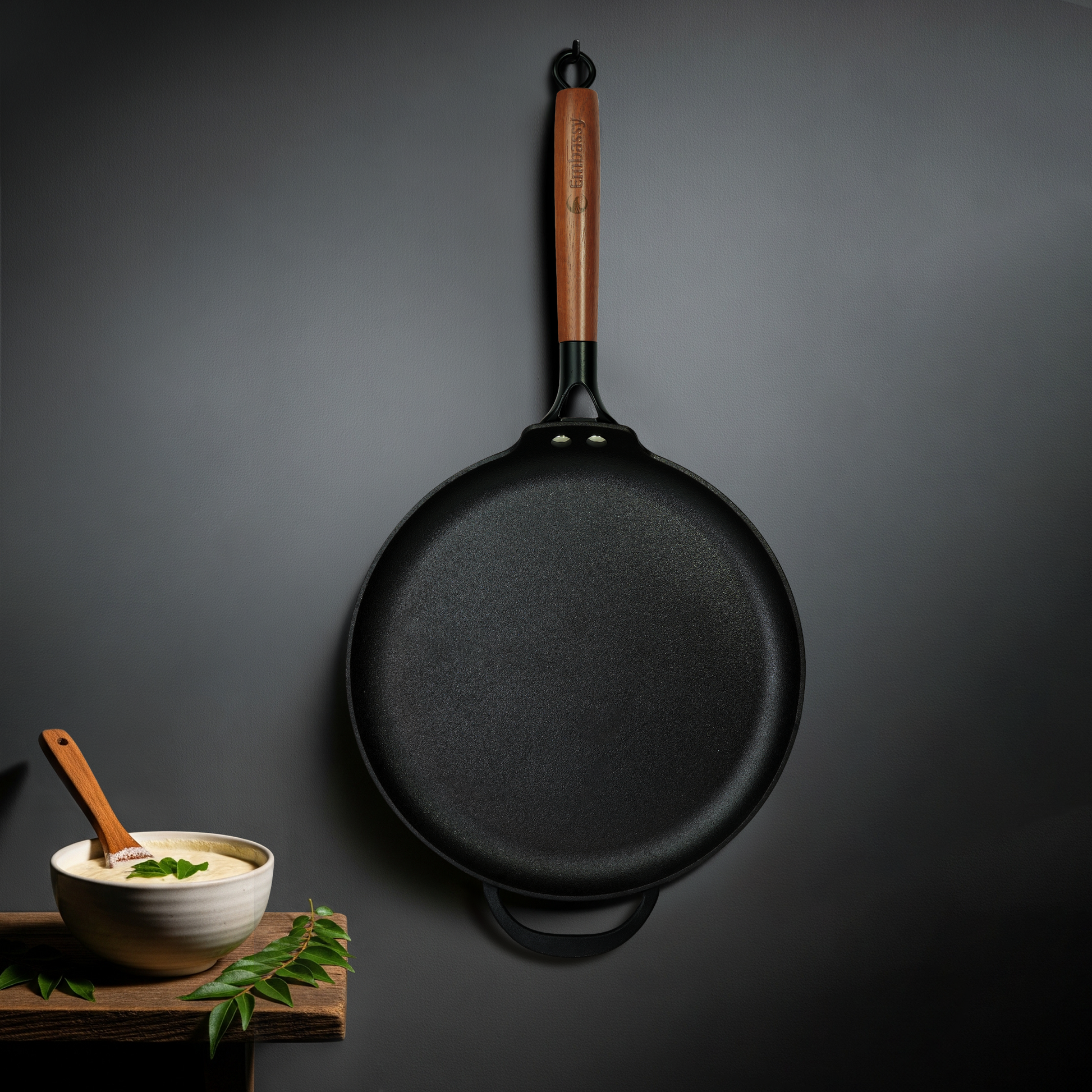 "The art of a perfect dosa begins here, with the Embassy Touchstone Cast Iron Dosa Tawa." Born from fire and tradition, every piece is handcrafted to bring timeless charm and lasting performance to your kitchen. Its naturally seasoned surface delivers that signature crisp, golden on the outside and tender within, capturing the true soul of South Indian cooking. Free from synthetic coatings or chemicals, it enriches every meal with a touch of natural iron and authenticity. With time, it only gets better, developing a natural patina that tells its own story of use, care and shared memories.